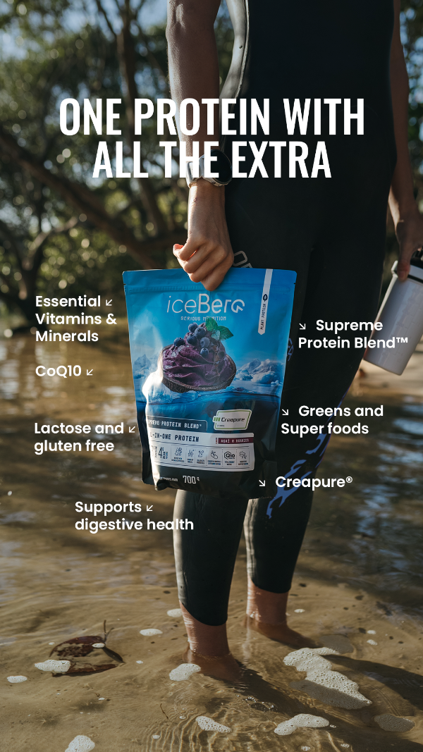 Discover complete nutrition with Iceberg All-in-One Protein, your essential partner in nourishment and vitality. Our unique advanced formula blends premium superfoods, 3g of Creapure®, and a scientifically designed holistic formulation to provide the essential nutrients your body needs. With a rich açaí and berries flavour, it’s a delicious way to fuel your body with nature’s finest.