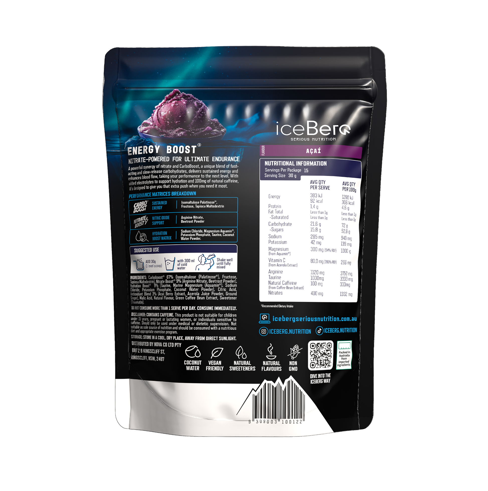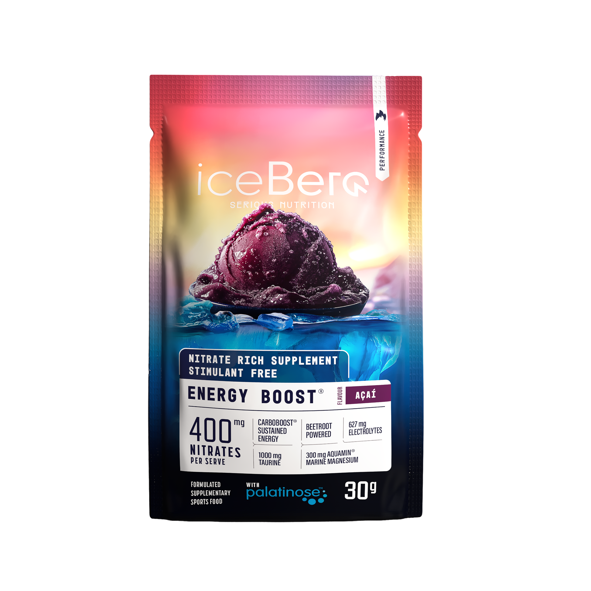 CarboBoost® 67% (Isomaltulose (Palatinose®), Fructose, Glucose, Tapioca Maltodextrin), Nitrate Boost® 9% (Arginine Nitrate, Beetroot Powder), Hydration Boost® 9% (Taurine, Marine Magnesium (Aquamin®), Sodium Chloride, Potassium Phosphate, Coconut Water Powder), Antioxidant Blend 3% (Açaí Berry Extract, Acerola Juice Powder, Ground Ginger, Green Coffee Bean Extract), Malic Acid, Natural Flavour, Sweetener (Thaumatin).