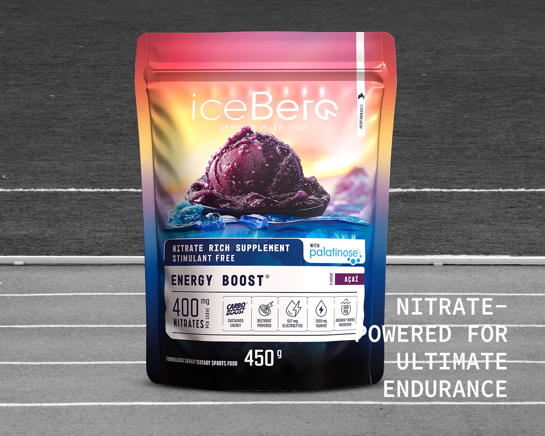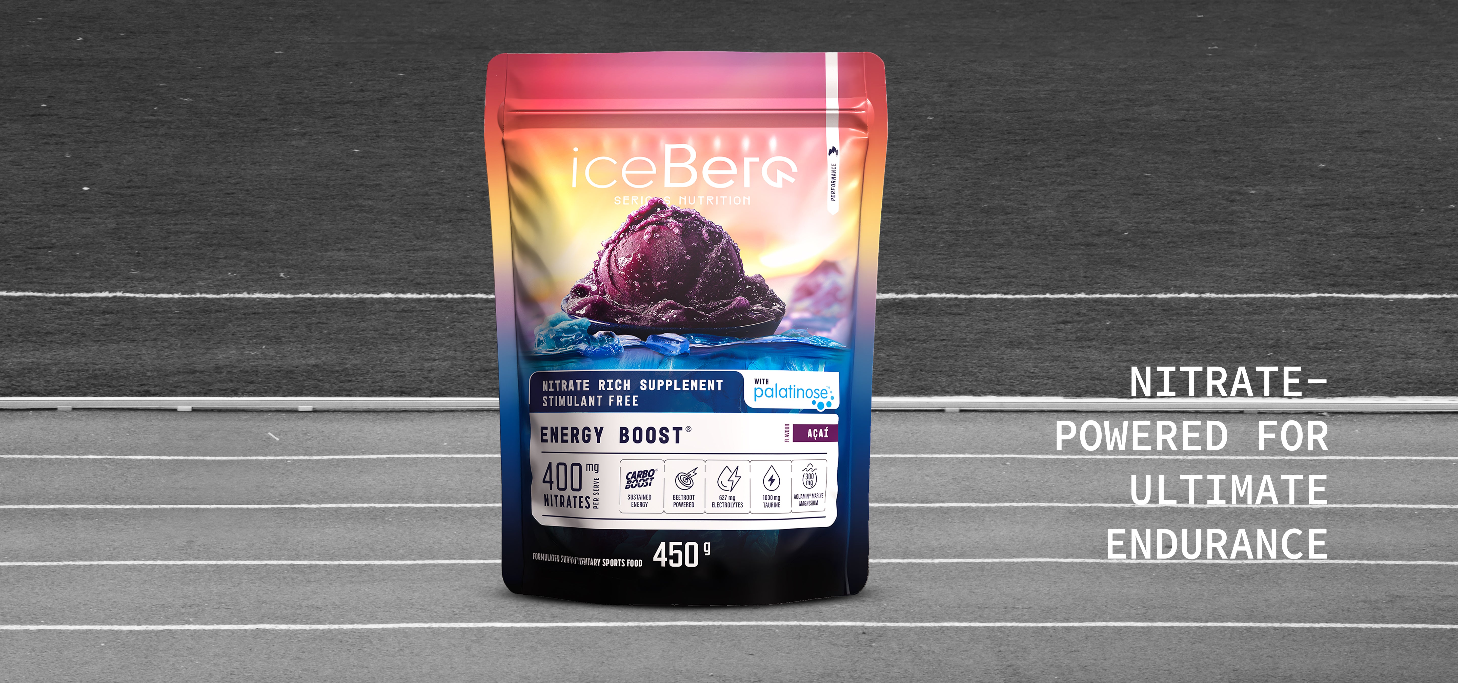 CarboBoost® 67% (Isomaltulose (Palatinose®), Fructose, Glucose, Tapioca Maltodextrin), Nitrate Boost® 9% (Arginine Nitrate, Beetroot Powder), Hydration Boost® 9% (Taurine, Marine Magnesium (Aquamin®), Sodium Chloride, Potassium Phosphate, Coconut Water Powder), Antioxidant Blend 3% (Açaí Berry Extract, Acerola Juice Powder, Ground Ginger), Malic Acid, Natural Flavour, Sweetener (Thaumatin).