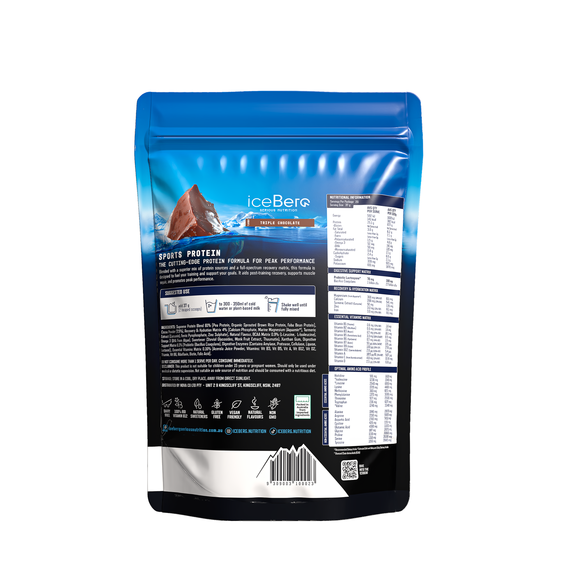 Our Sports Protein is more than a protein source; it’s a complete recovery and performance formula designed for optimal bioavailability and deep nourishment. Each serve delivers 25g of our Supreme Protein Blend® with an optimal amino acid profile, plus 300mg of Marine Magnesium (Aquamin®), electrolytes, and essential vitamins. Enriched with 1 billion CFU probiotics and digestive enzymes, it supports gut health and maximizes nutrient absorption. A clean, vegan-friendly formula with Omega 3 from algae and antioxidants to restore, repair, and keep your body performing at its best.